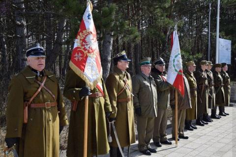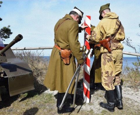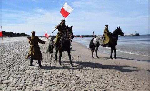Następnie przedstawiciele grupy rekonstrukcyjnej (w umundurowaniu z epoki) na szczycie nadmorskiej wydmy wkopali symboliczny, biało - czerwony słup graniczny z przewieszonymi dwiema kawaleryjskimi szablami jako potwierdzenie stałej obecności Polski nad Bałtykiem.
